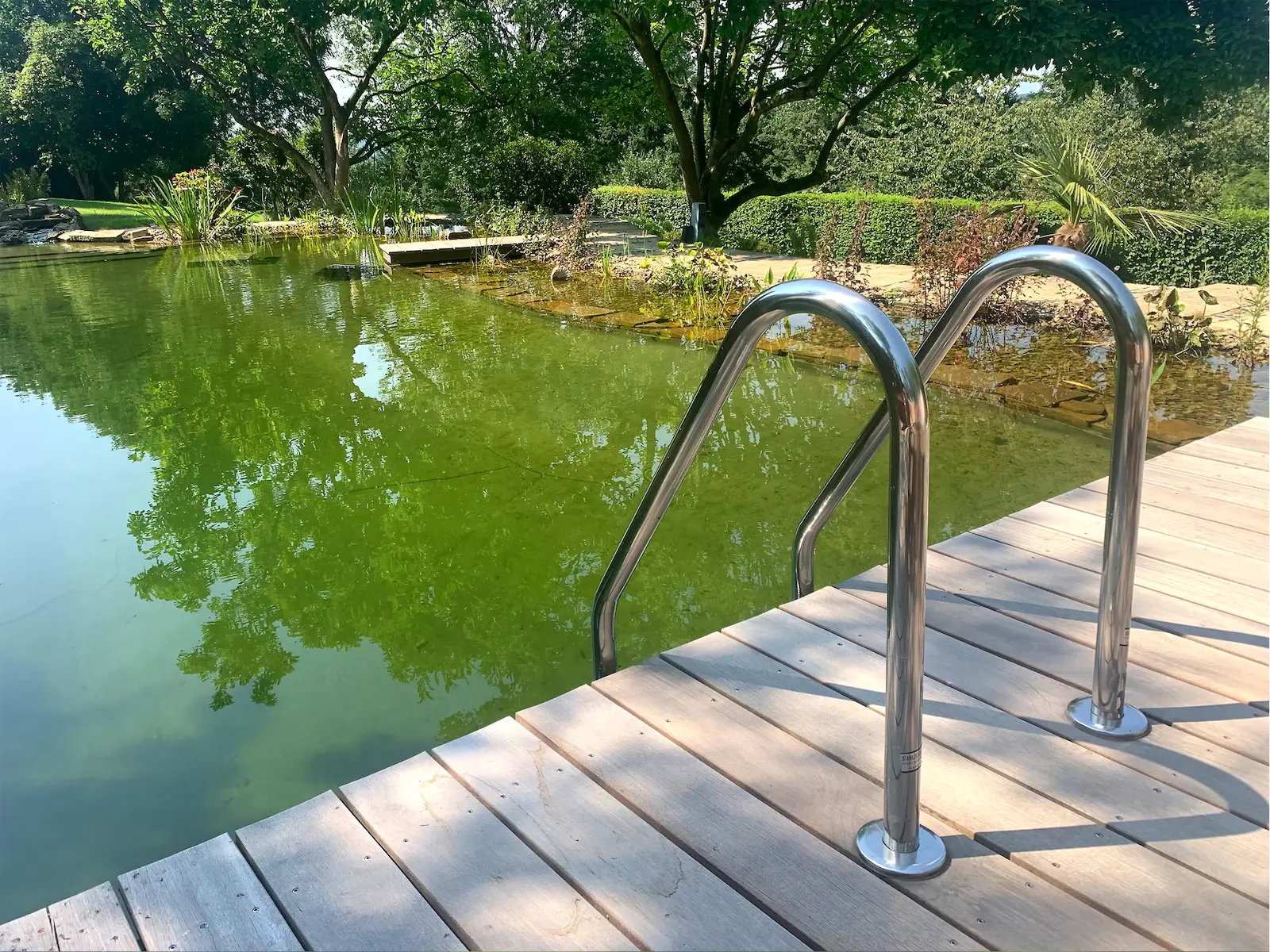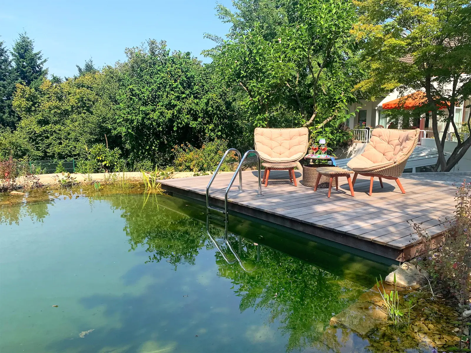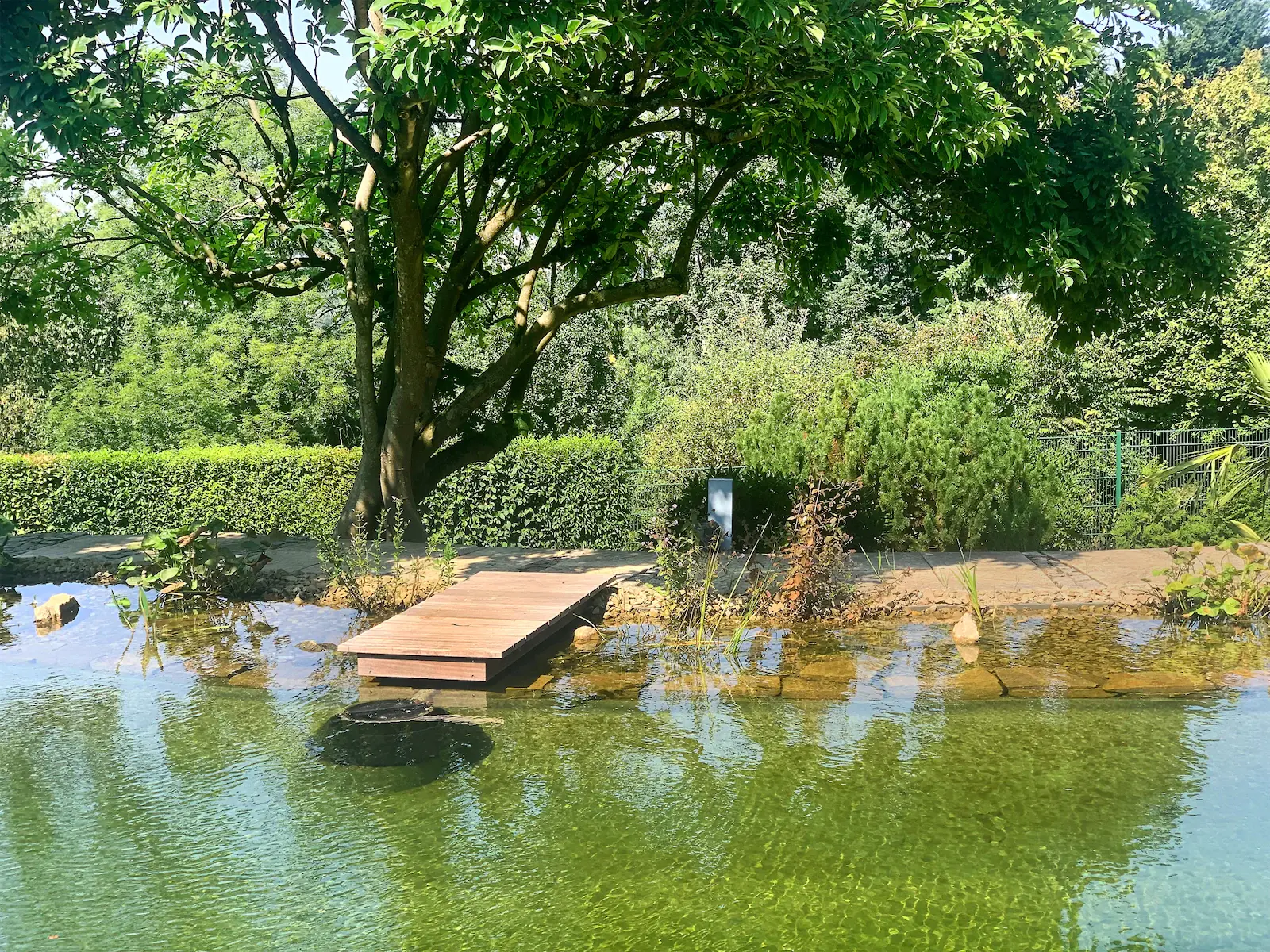 Anstelle des alten, undichten Teiches entstand ein Naturschwimmteich. Dafür musste tiefer ausgeschachtet werden. Trockenmauern decken im Randbereich die Folie ab. Holzstege mit Beleuchtung sowie das Deck mit Leitereinstieg erleichtern den Zugang. Selbstreinigende Trommelfilter halten das Wasser bequem sauber.