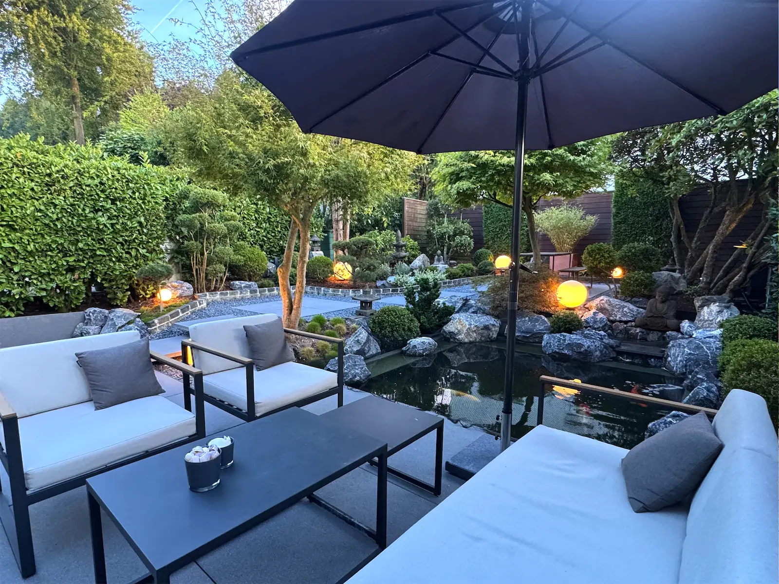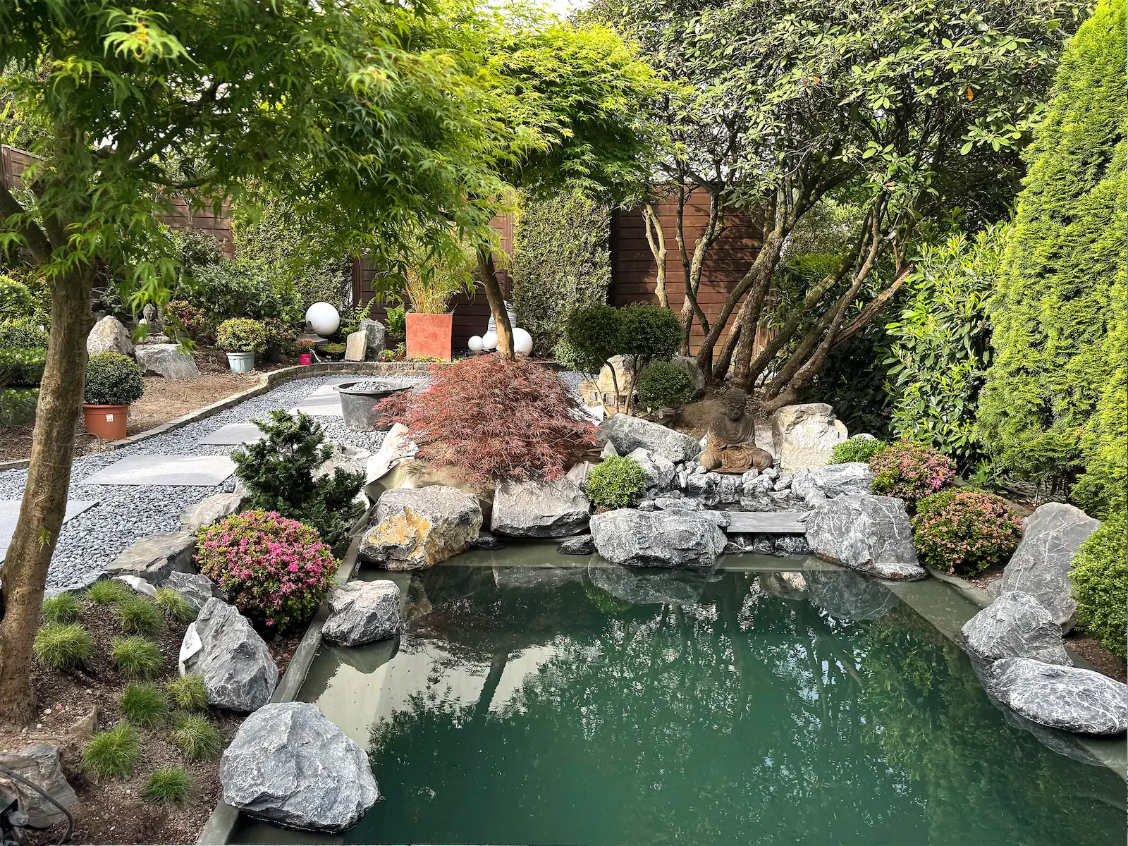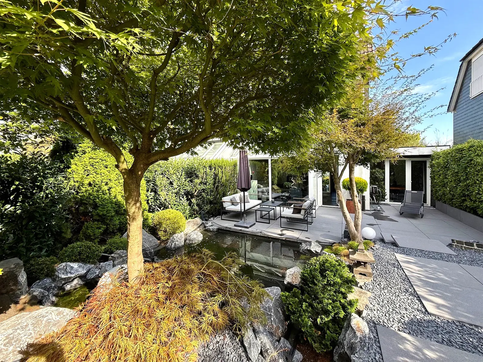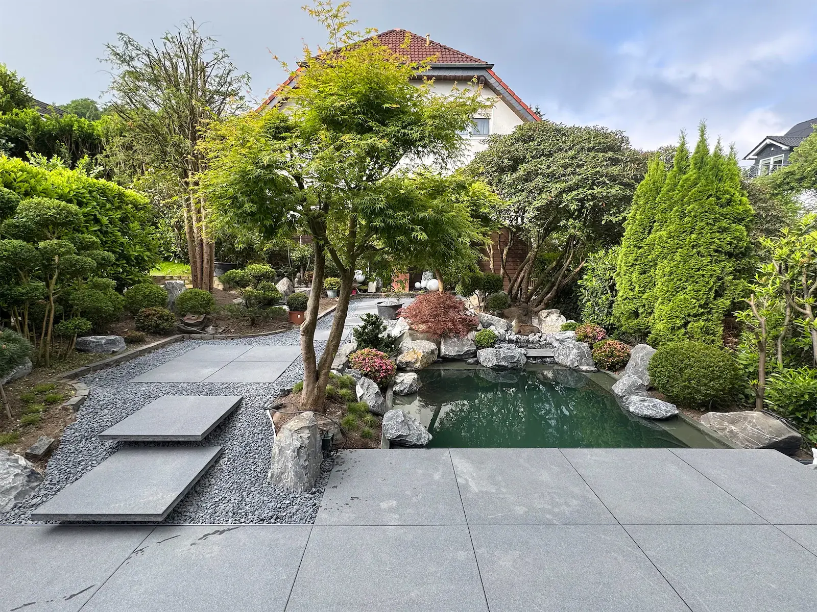 Der Reihenhausgarten wurde nach den detaillierten Vorstellungen des Kunden erneuert. Natürliche Formen und grafische Ordnung umgeben den sanft bewegten, spiegelnden Teich. Die schweren Findlinge wurden „mit leichter Hand“ arrangiert. Großformatige Platten & Edelsplit beruhigen – bestehende Bepflanzung wurde neu angeordnet.